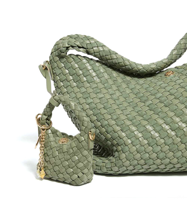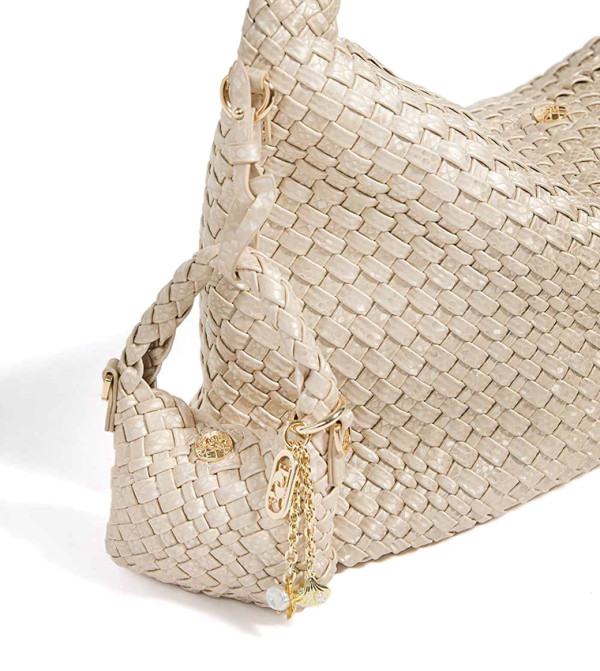 Our extra small Deliberate bag charm has been meticulously crafted in our signature weave and finished and features a miniature double D logo clasp and tiny pearl and gem stone charms